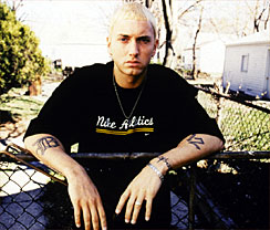 b. Marshall Bruce Mathers III, 17 October 1973, Kansas City, Missouri, USA. This white rapper burst onto the US charts in 1999 with a controversial take on the horrercore genre. Mathers endured an itinerant childhood, living with his mother in various states before eventually ending up in Detroit at the age of 12. He took up rapping in high school before dropping out in ninth grade, joining ad hoc groups Basement Productions and the New Jacks, and, later, the duo Soul Intent. The newly christened Eminem released a raw debut album in 1997 through independent label FBT. Infinite was poorly received, however, with Eminem earning unfavourable comparisons to leading rappers such as Nas and AZ. His determination to succeed was given a boost by a prominent feature in Source's Unsigned Hype column, and he gained revenge on his former critics when he won the Wake Up Show's Freestyle Performer Of The Year award, and finished runner-up in Los Angeles' annual Rap Olympics. The following year's The Slim Shady EP featured some vitriolic attacks on his detractors. The stand-out track, "Just Don't Give A Fuck', became a highly popular underground hit, and led to guest appearances on MC Shabaam Sahddeq"s "Five Star Generals" single and Kid Rock's Devil Without A Cause set. As a result, Eminem was signed to Aftermath Records by label boss Dr. Dre, who adopted the young rapper as his prot‚g‚ and acted as co-producer on Eminem's full-length debut. Dre's beats featured prominently on The Slim Shady LP, a provocative feast of violent, twisted lyrics, with a moral outlook partially redeemed by Eminem's claim to be only "voicing" the thoughts of the Slim Shady character. Parody or no parody, lyrics to tracks such as "97 Bonnie & Clyde" (which contained lines about killing the mother of his child) and frequent verbal outbursts about his mother were held by many, outside even the usual Christian moral majority, to be deeply irresponsible. The album was buoyed by the commercial success of the singles "My Name Is" and "Guilty Conscience" (the former helped by a striking, MTV -friendly video), and climbed to number 2 on the US album chart in March 1999. Eminem subsequently made high profile appearances on Rawkus Records' Soundbombing Volume 2 compilation and Missy "Misdemeanor" Elliott's Da Real World. He was also in the news when his mother filed a lawsuit claiming that comments made by the rapper during interviews and on the Slim Shady LP had caused, amongst other things, emotional distress, damage to her reputation and loss of self-esteem. None of which harmed the sales of Eminem's follow-up album, The Marshall Mathers LP, which debuted at number 1 on the US album chart in May 2000 and established him as the most successful rapper since the mid-90s heyday of 2Pac and Snoop Doggy Dogg. By the end of the year, however, his troubled personal life and a serious assault charge had removed the gloss from his phenomenal commercial success. Despite criticism from gay rights groups, the rapper swept up three Grammy Awards the following February.